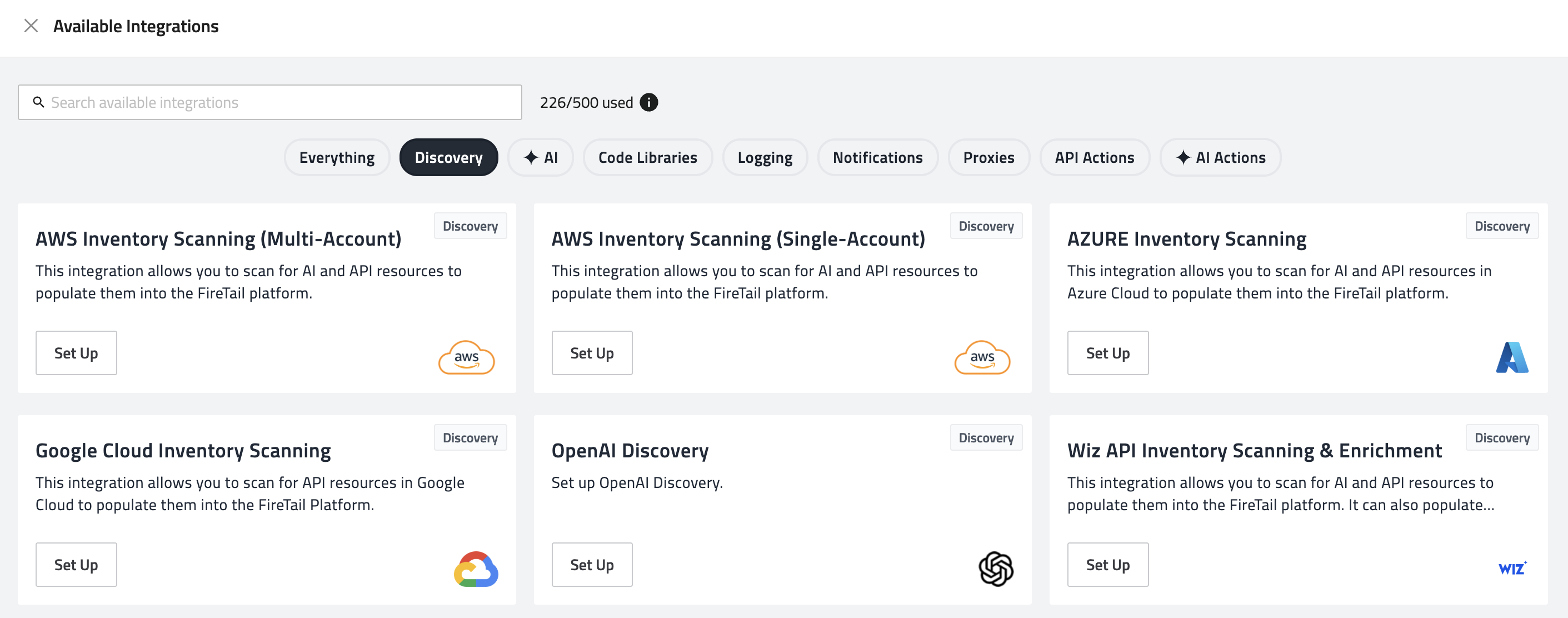 Set up integrations to gain full visibility into your APIs and AI resources. FireTail supports automated discovery by connecting to your cloud environments and repositories.