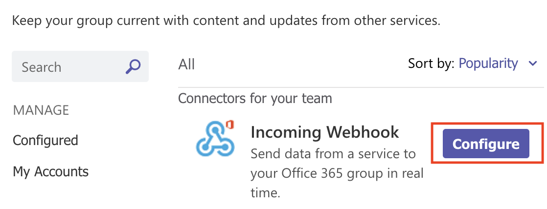 Note: If you've already added an Incoming Webhook, the Configure option appears. Select Configure to create an Incoming Webhook.