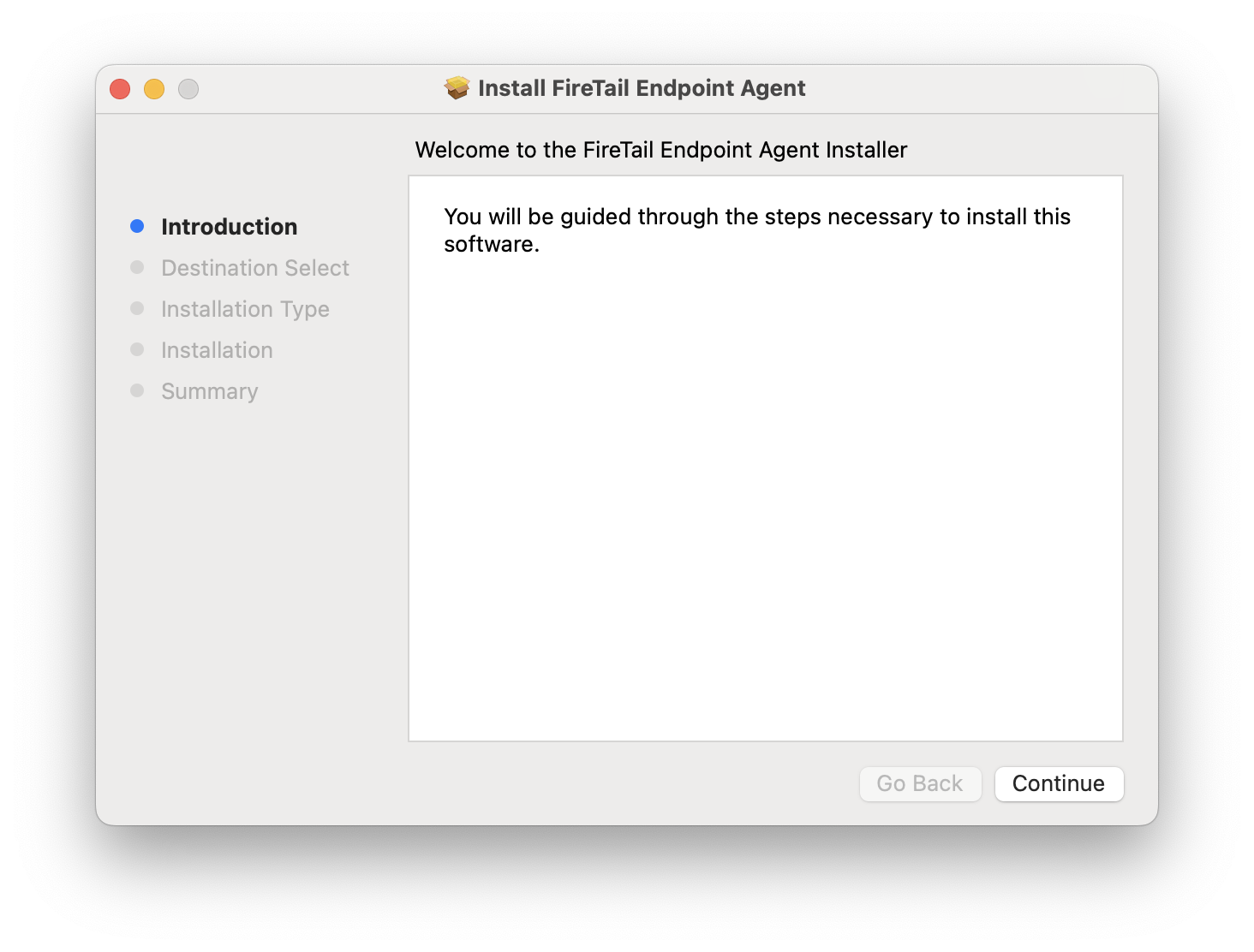 The FireTail Endpoint Agent is available for MacOS as a .pkg. The .pkg can be distributed to users and installed by following an installation wizard, or deployed at scale using your company's MDM software.