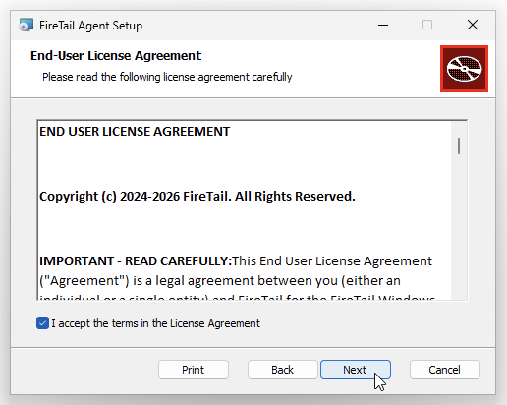 The FireTail Endpoint Agent can be installed on Windows using an installation wizard. Click "Next".