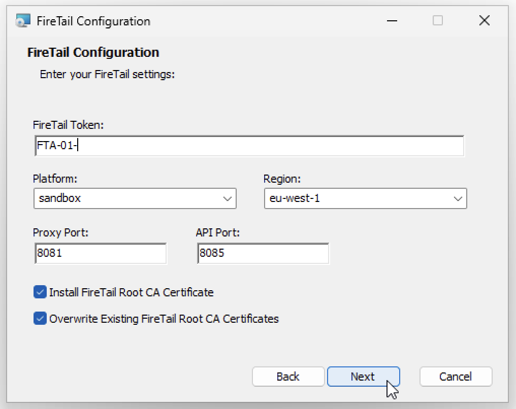 - Whether the installation wizard should overwrite any existing certificates from previous installations of the FireTail Endpoint Agent.