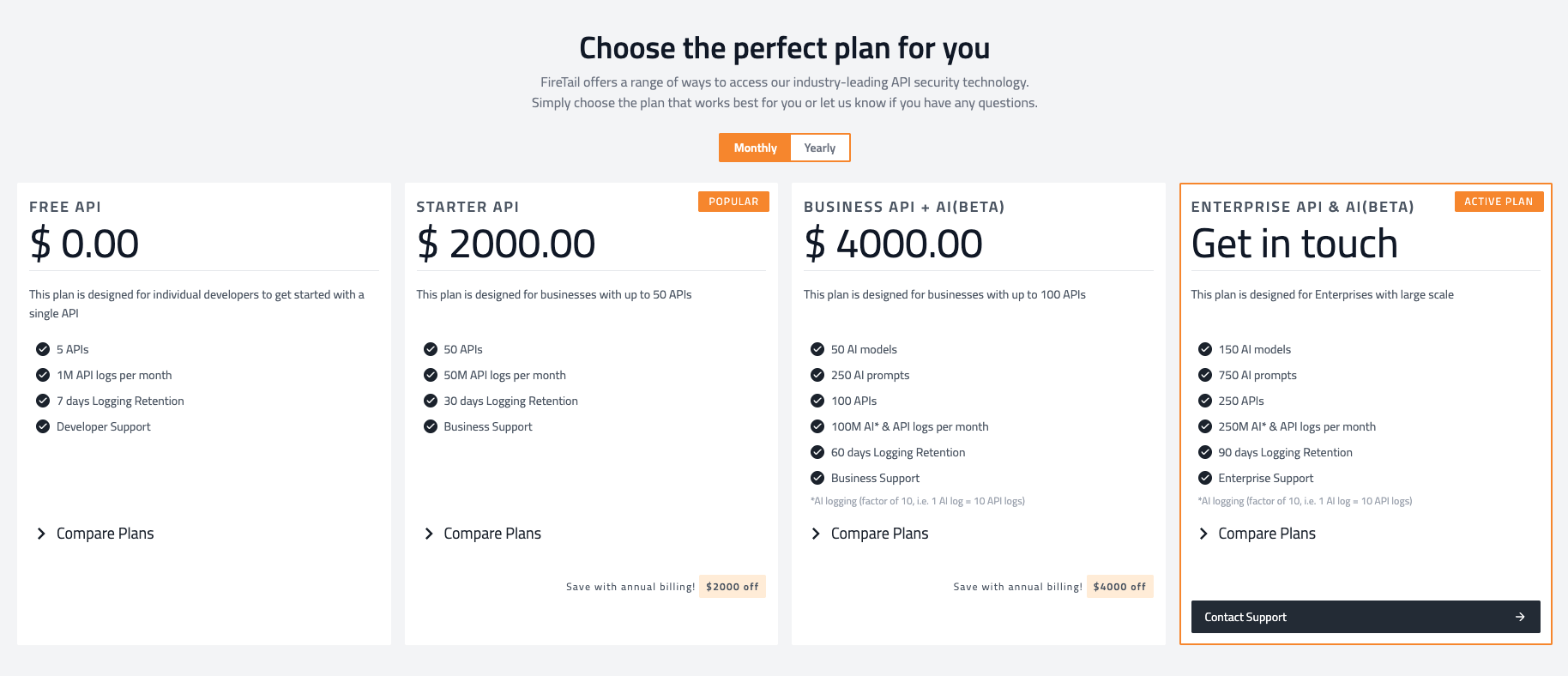 | 1 million API logs per month | 50 million API logs per month | 100 million AI & API logs per month | 250 million AI & API logs per month |