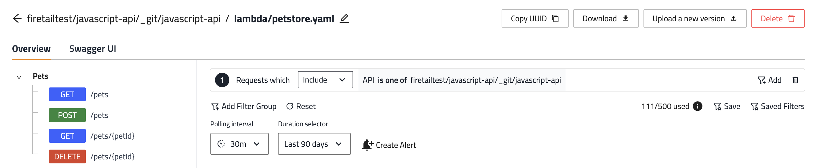 You can replace the existing version of a specification by uploading a new specification. The new version must be a .json or .yml file.