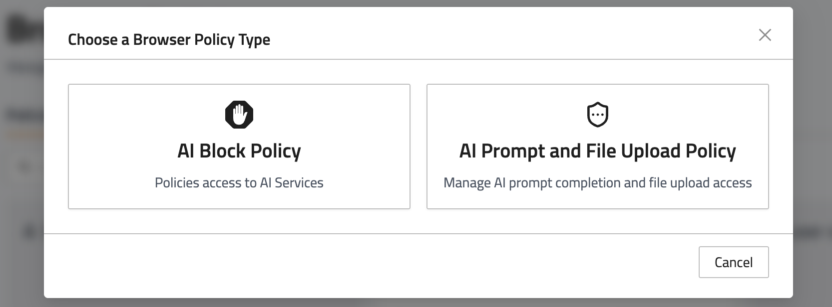 Browser policies enable you to define policies for managing access to AI platforms. These policies act as monitors that detect when Workforce resources attempt to access or use an AI platform, and perform an action to manage the use of that platform.