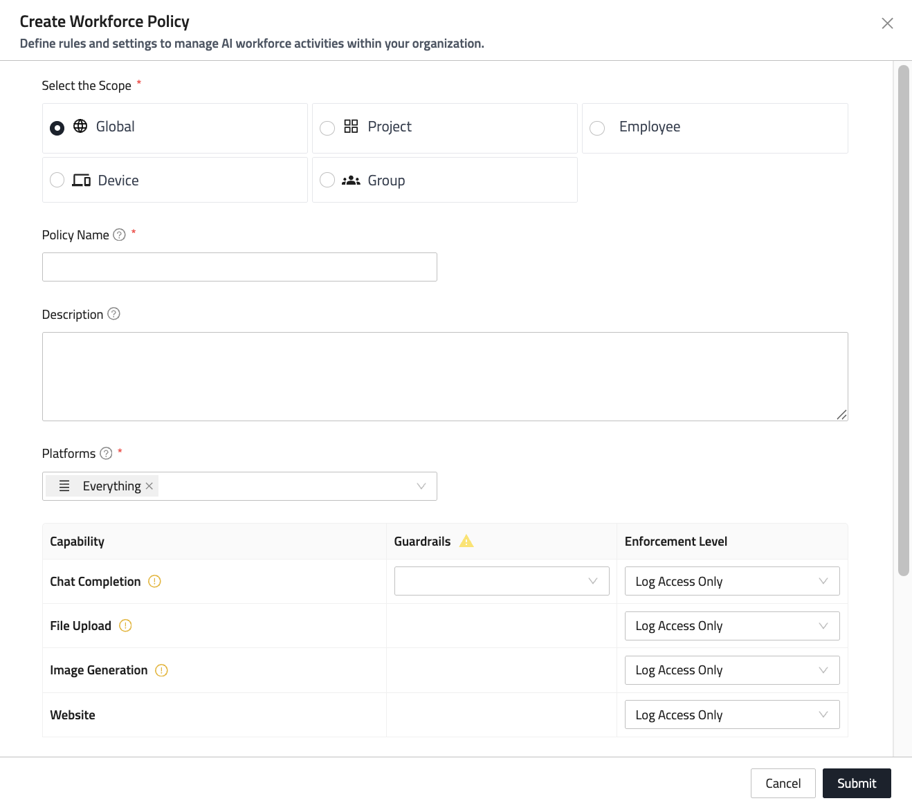 Workforce policies enable you to define policies for managing access to AI platforms. These policies act as monitors that detect when Workforce resources attempt to access or use an AI platform, and perform an action to manage the use of that platform.